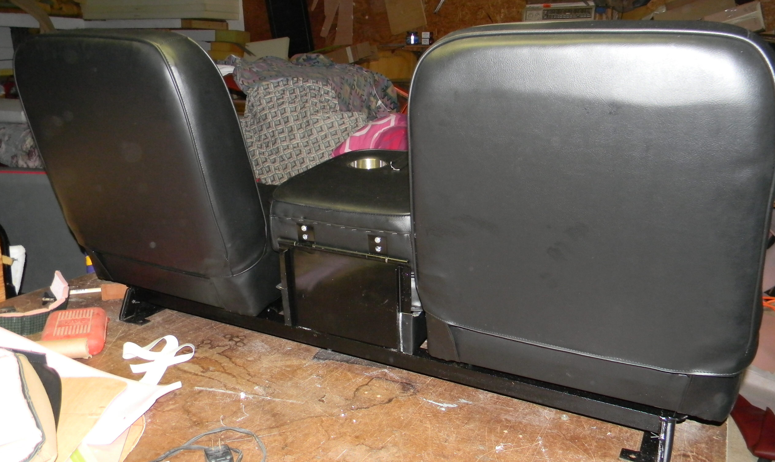 Custom Built Buddy Bucket Style FRAMES Covered in your choice of fabrics buddy has cup holders as well as metal box liner both driver and passenger buckets move to make leg more comfortable. Also comes with the covers for the floor mounts covers.